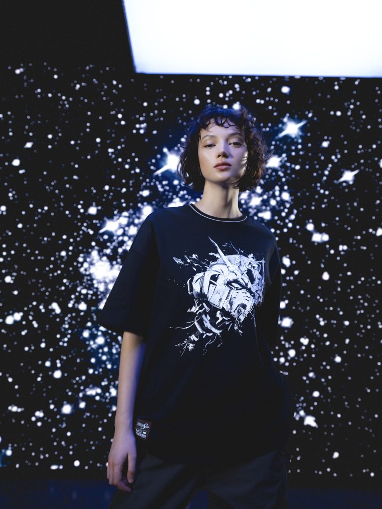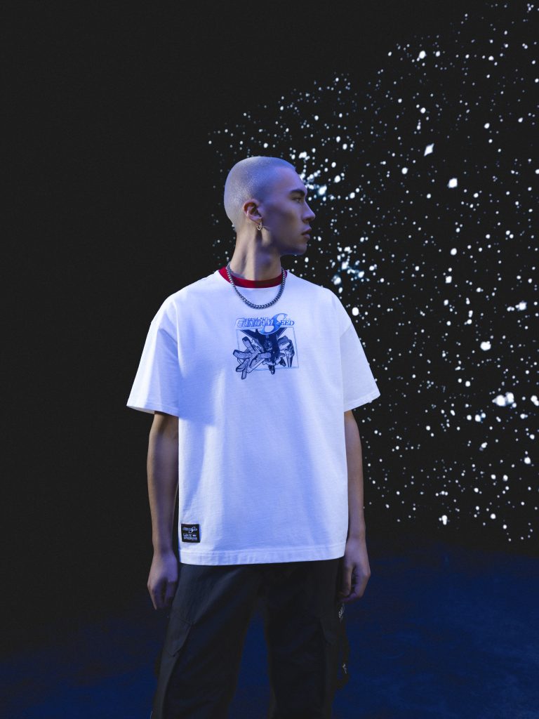 También incluye atrevidas camisetas. La Boxy Tee, disponible en Starbright White y Destruction Black, presenta gráficos de Gundam (Strike Gundam y GAT-X105 Strike Gundam respectivamente) y un parche en jacquard tejido. La camiseta de manga larga azul oscuro presenta un llamativo estampado ZGMF-X10A Freedom Gundam en la espalda. Por último, la sudadera roja con capucha presenta un brillante estampado GAT-X303 Aegis Gundam en el centro del pecho y un parche jacquard en la manga izquierda.